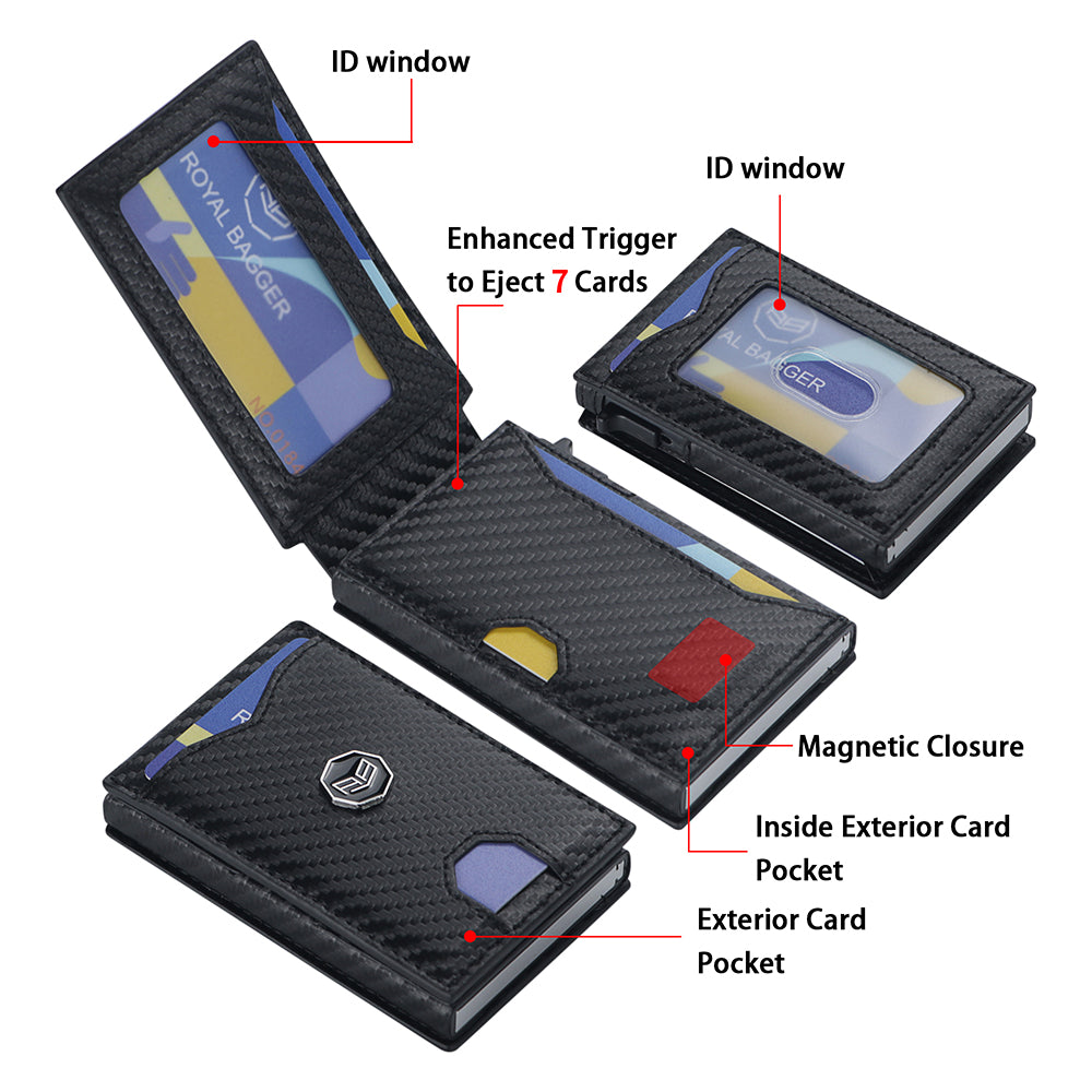 The Royal Bagger Carbon Fiber Men's Wallet offers quick card access and RFID blocking. It features a 12-card capacity with an ID window and a magnetic closure. Perfect for organized storage, this wallet ensures your cards are secure and easily accessible. 📱